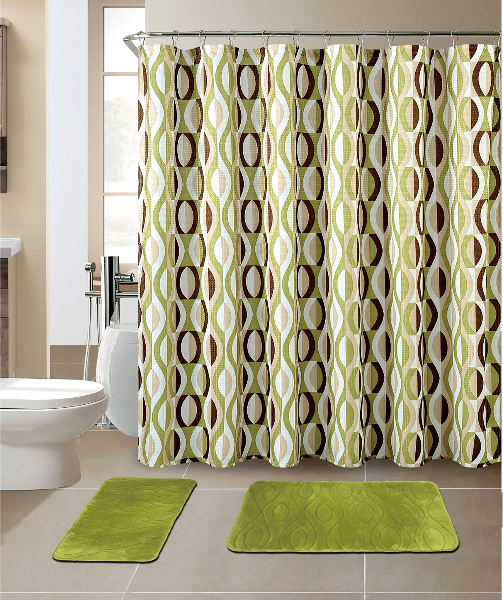 Details: Revive your bathroom instantly with this 15-piece set from CityLux Linen. Choose a shower curtain from a selection of rich, saturated colors and patterns designed to brighten up any space. The fabric shower curtains come ready to hang with a set of 12 low-profile roller ball curtain hooks. These hooks will easily accommodate an additional shower curtain liner if you prefer an extra water barrier (liner sold separately). The set comes complete with a large and medium bath mat for a perfect color match. Mats are made of memory foam to reduce foot fatigue and come with a non-slip rubber backing for safety.